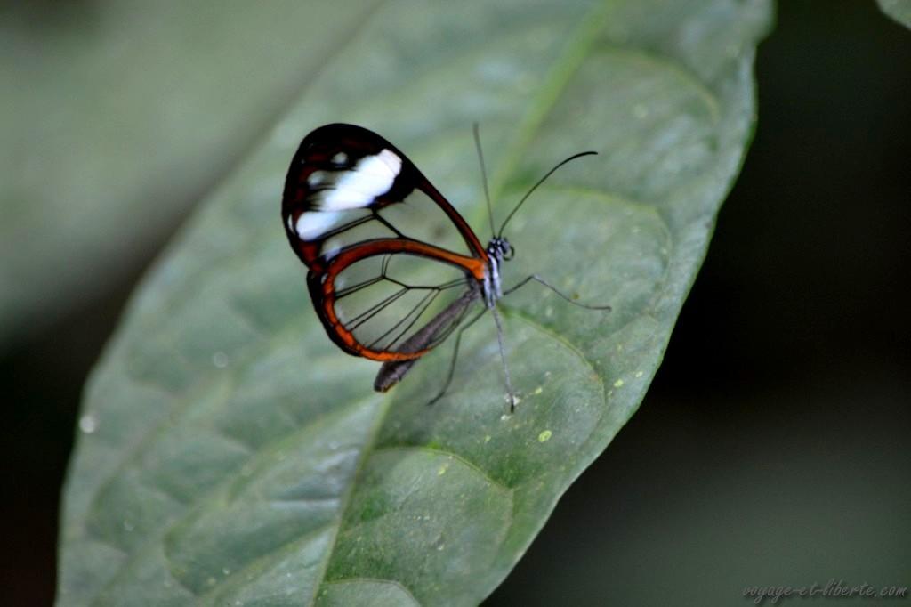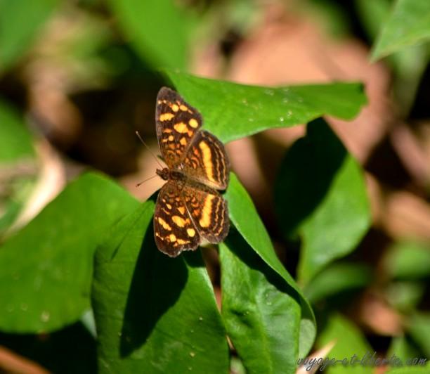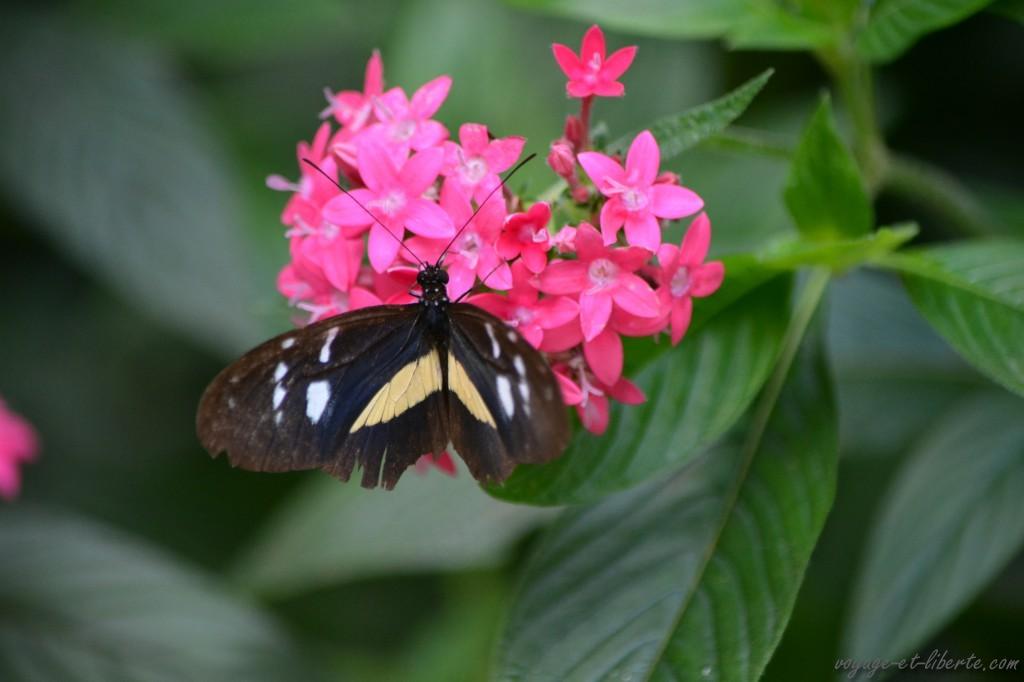Comme nous sommes en semaine, l’endroit est d’un calme absolu, ce qui nous permet d’observer de très nombreux papillons qui viennent voler autour de nous. Nous n’en avons jamais vu autant à la fois en liberté, c’est exceptionnel. Et cela d’autant plus que vole le fameux papillon bleu fluo dont le nom m’échappe.