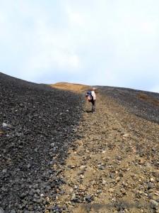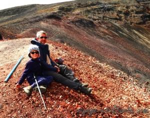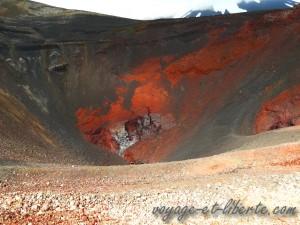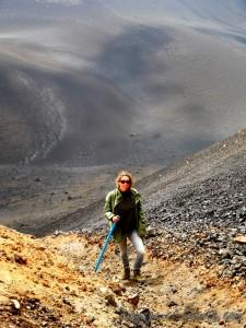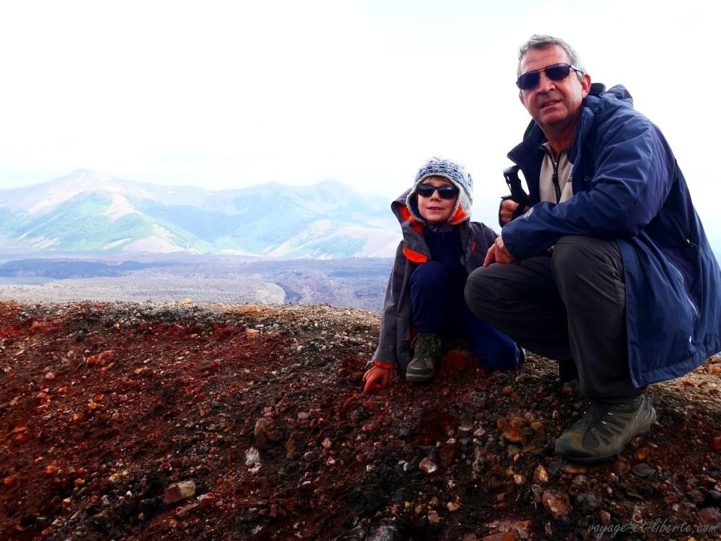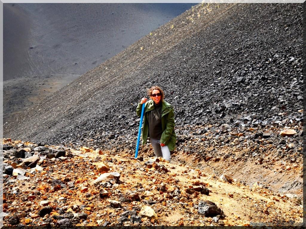 La marche est assez pénible car on s’enfonce à chaque pas et la grimpette au cratère très raide. Qu’importe ! Le paysage en vaut largement la peine ! Charles est ravi : il y a de nombreuses fumerolles et les pierres sont très chaudes ! Comme en Islande !