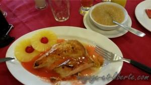 Alors la, on mange bien et copieusement a Montevideo ! De la viande grillee … aux plats plus … originaux, comme ce poulet aux ananas a la compote directement sorti du livre des meileures recettes de mamie Paulette hi hi