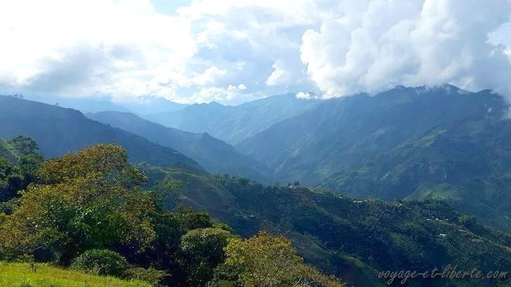 Nous voici donc partis, presque en slips, tellement il fait chaud, direction Manizales. 140 kms nous en séparent. Une paille. Pffff … on avait juste oublié qu’il fallait franchir un mur, euh… une montagne impressionnante pour y parvenir. Et nous nous élevons, passant en 2 heures de 250 mètres d’altitude à 3800 mètres de hauteur. En slips, donc. Ou presque. Comment on l’a apprécié notre masque-cache-nez quand nous sommes restés coincés pendant une heure dans un embouteillage provoqué par rien du tout ! Pour un peu on se tricotait un gilet avec le reste du paquet ! A 2200 mètres d’altitude Manizales se fait presque printanière et douce, en comparaison !