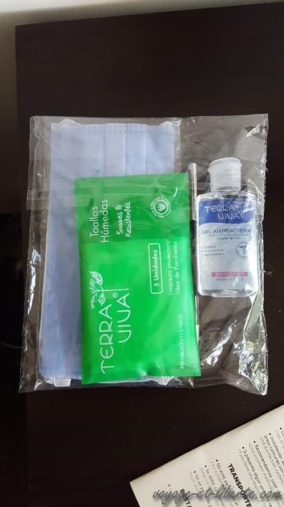 Nous trouvons un chouette hôpital pour nous héberger. Il s’agit d’un hôtel centre des congrès, trrrrès à cheval sur les protocoles sanitaires (Estelar recinto del pensamiento). A la réception, on ne rigole pas. Le monsieur est barricadé derrière une vitre en plexi et porte lui-même un masque et une visière en plastique par-dessus. Quand il me parle, c’est bien simple, je n’entends rien et ne comprends rien ! Mais alors rien ! Mes oreilles ne se sont pas adaptées assez vite aux fantaisies du conarovirus. Prise de température pour tout le monde, inscription sur un registre, signatures, désinfection des mains et des chaussures (je l’adore celle là !), vérification du port correct du masque, remise d’un kit anti-covid. Nous sommes prêts à entrer. Je ne sais pas si c’est censé rassurer les gens, mais moi, ça me fait peur toutes ces conneries. Au resto de l’hôtel, c’est pire. On nous donne des sachets dans lesquels ranger nos masques pour ne pas contaminer les tables, le serveur désinfecte tout et partout, une chaise sur deux est barrée de scotch …