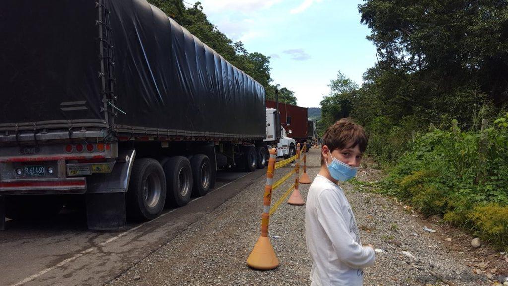 Nous voici donc partis de fort bonne humeur, en ce jeudi matin. Direction Honda, dans le département du Tolima, en climat trrrès chaud. Bien sûr, comme nous vivons H24 ensemble, nous décidons de ne pas nous museler. Nous nous sentons d’autant plus légitimes à enfreindre cette règle stupide que nous n’avons jamais mordu personne, pas même un pompiste qui se serait trompé sur la monnaie ! Alors pourquoi nous imposer cela ??? Erreur, ô erreur ! A chaque fois que nous croisons un uniforme (et ils sont nombreux en Colombie), nous bondissons sur nos masques comme des fous, pour ne pas nous faire verbaliser. Le stress commence à s’installer. On dirait des français récalcitrants des années 1980, tirant frénétiquement sur leurs ceintures de sécurité pour ne pas prendre un PV à l’approche d’un gendarme hihi. Sauf que là, c’était avec des muselières. Le truc bien relou quand tu as 6 heures de route brûlante devant toi…
