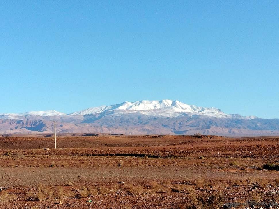 Ouarzazate ? On oublie si c’est pour la chaleur hivernale. Cette année, comme la précédente, que ce soit en décembre, janvier ou février, on s’est plus souvent gelé que fait bronzer à poil. Certes, le soleil resplendissait dans un ciel azur, mais quand le vent passe au-dessus des montagnes enneigées, c’est glacial ! Et la nuit, il peut geler. Bref, un manteau peut-être utile aux plus frileux (moi, moi et moi