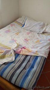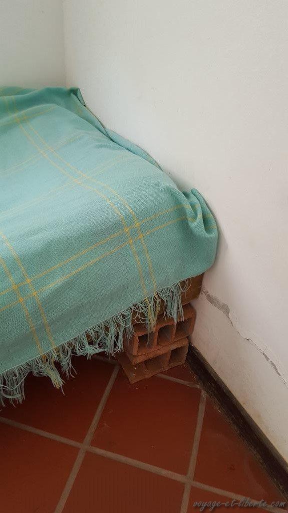 Le temps passant nous finissons par jeter notre dévolu sur une « cabaña » qui, vue de l’extérieur, est très jolie. C’est déjà pas mal. En outre, elle est au même prix que les chambres que nous louons chez nous à Guatapé : c’est l’occasion de voir ce que les autres proposent à un tarif similaire. Mais c’était sans compter sur l’obscurité qui ne nous permet pas de déceler l’essentiel : les literies sont pourries – les matelas défoncés reposent sur des briques ou des palettes, la salle de bain est un cagibi sans miroir où les toilettes fuient et le linge est d’une propreté très douteuse. Quant à la clim, nécessaire en raison des 35 degrés ambiants, elle est hors d’usage. Trop tard : nous avons déjà payé nos 165 000 pesos (un peu plus de 45 euros) et nous devrons (essayer de) dormir ici. En vain. Notez qu’on a eu de la chance, en saison c’est 300 000 pesos